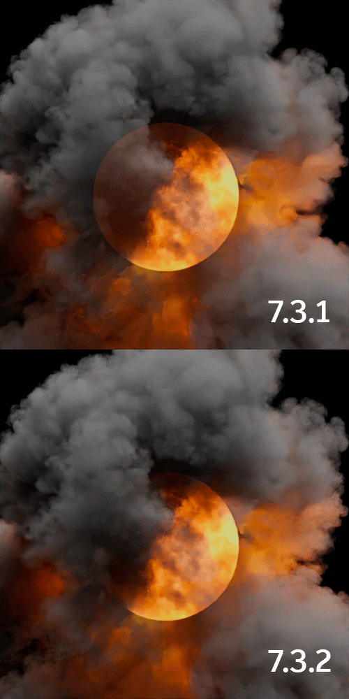 همانطور که میدونید رندر Volume در هر موتور رندری خیلی زمانبر، سنگین و البته همراه با نویز می باشد. بنابراین موتور رندرها همیشه سعی دارند در بحث رندرینگ Volume، الگوریتم های خودشون رو آپدیت کنند تا سرعت بالاتر به همراه نویز کمتر برای رندر، داشته باشند. حالا موتور رندر آرنولد از نسخه های قبل تا به الان، بر روی بهبود volume rendering کار کرده است که در این نسخه به گفته آتودسک، قابلیت Denoising volumes در حال حاضر نتایج بهتری را ایجاد می کند. در واقع تغییرات در نحوه محاسبه volume albedo به Denoiser کمک می کند تا جزئیات بیشتری را حفظ کند. در تصویر زیر مقاسه نتیجه Denoising volumes در نسخه 7.3.1 با نسخه جدید 7.3.2 را مشاهده می کنید.