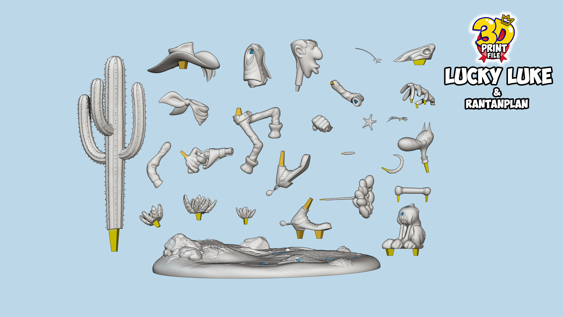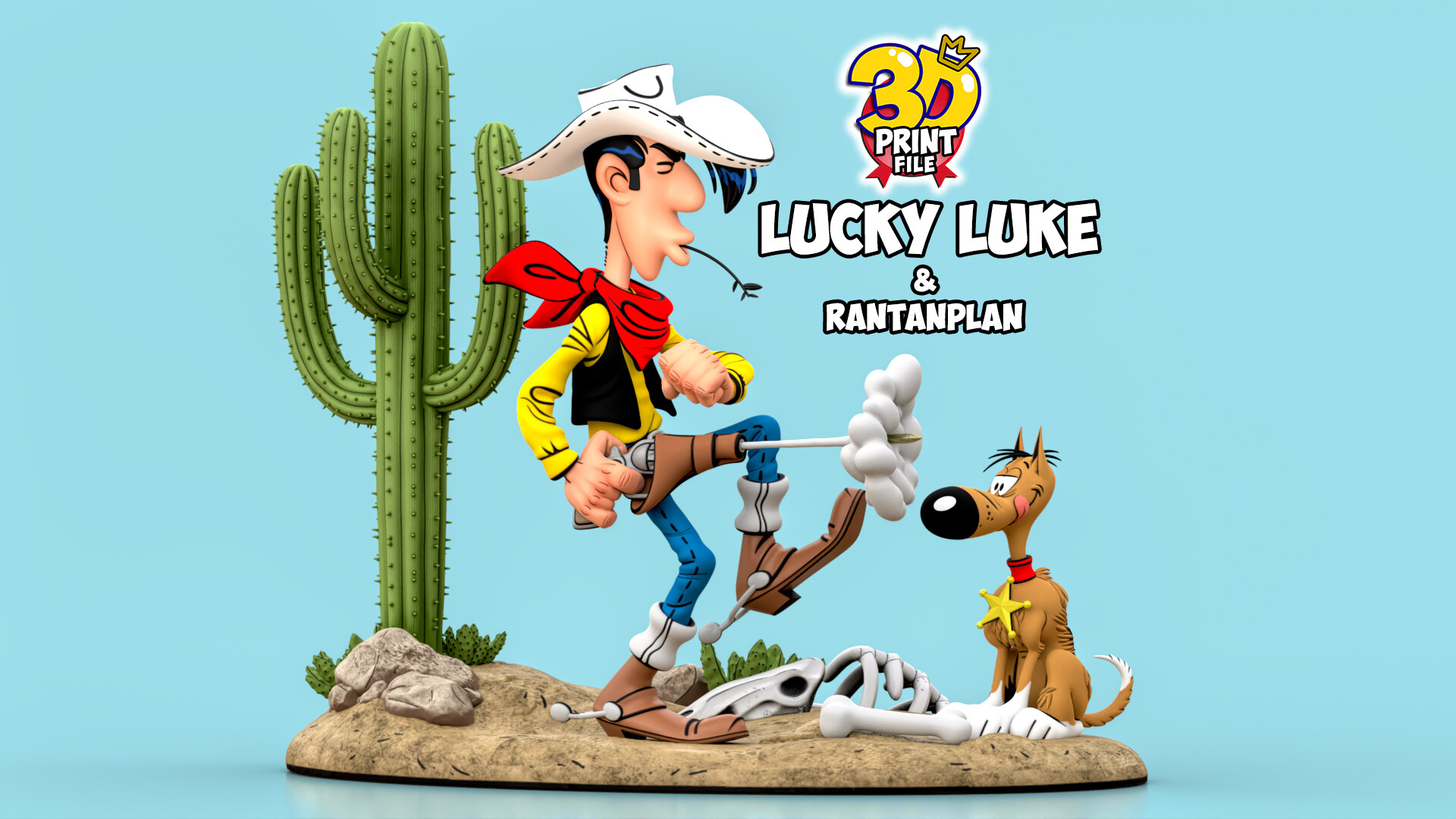 Lucky Luke & Rantanplan 3D Diorama - Free size https://cults3d.com/en/3d-model/art/lucky-luke-rantanplan-3d-diorama https://majidmahjoor7.artstation.com/store/Drly2/lucky-luke-rantanplan-3d-printable-diorama https://www.cgtrader.com/3d-print-models/art/sculpture/lucky-luke-and-rantanplan-3d-printable-diorama Hello my dear friends,🤗 I hope you are doing great. I am very happy to have prepared another diorama from scenes of Lucky Luke & Rantanplan for you. Faster than His Shadow This diorama includes one big base for those who want 2 characters on one base and includes 2 separate bases for those who like to put each model on one base.🥰 Available now with: - STL FILES - solid, hollowed and holed files - OBJ FILE - FBX FILE for 3D printing - 3D files are free of any errors - Each character is cut into small parts and put together with pins and holes (please see the parts in the model photos) - The total height of the statue: 17 cm📏 - You can change the height of the model to your desired size! - The size of the files is small and the quality is high - This is a FAN ART just FOR YOU 💙🌼 -Ability to print with RESIN and FDM printers😊 -I will be happy if you print the model and share the photos with me😍🙏